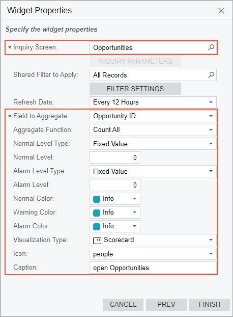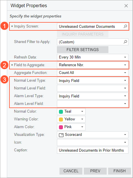 The source of the calculation of a KPI is data collected by an inquiry from the system database. You select a source inquiry in the Inquiry Screen box of the Widget Properties dialog box for a KPI widget (see Item 1 in the screenshot below). You can use a predefined inquiry or develop one that suits your needs by using the Generic Inquiry (SM208000) form.