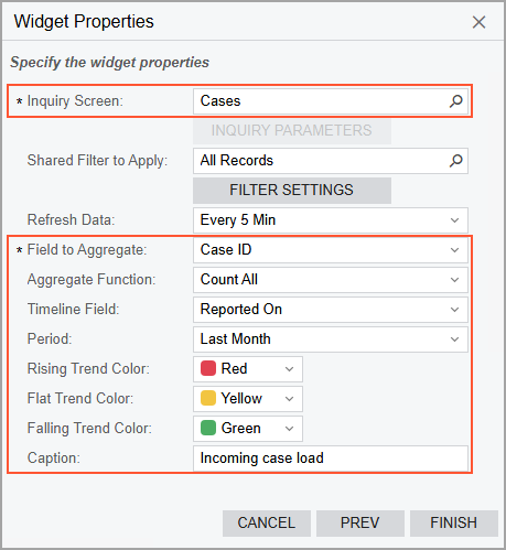 To add a trend card widget, you select the Trend Card KPI widget type in the Add Widget dialog box, which opens when you click Add a New Widget in a widget placeholder. You specify the following settings in the Widget Properties dialog box: