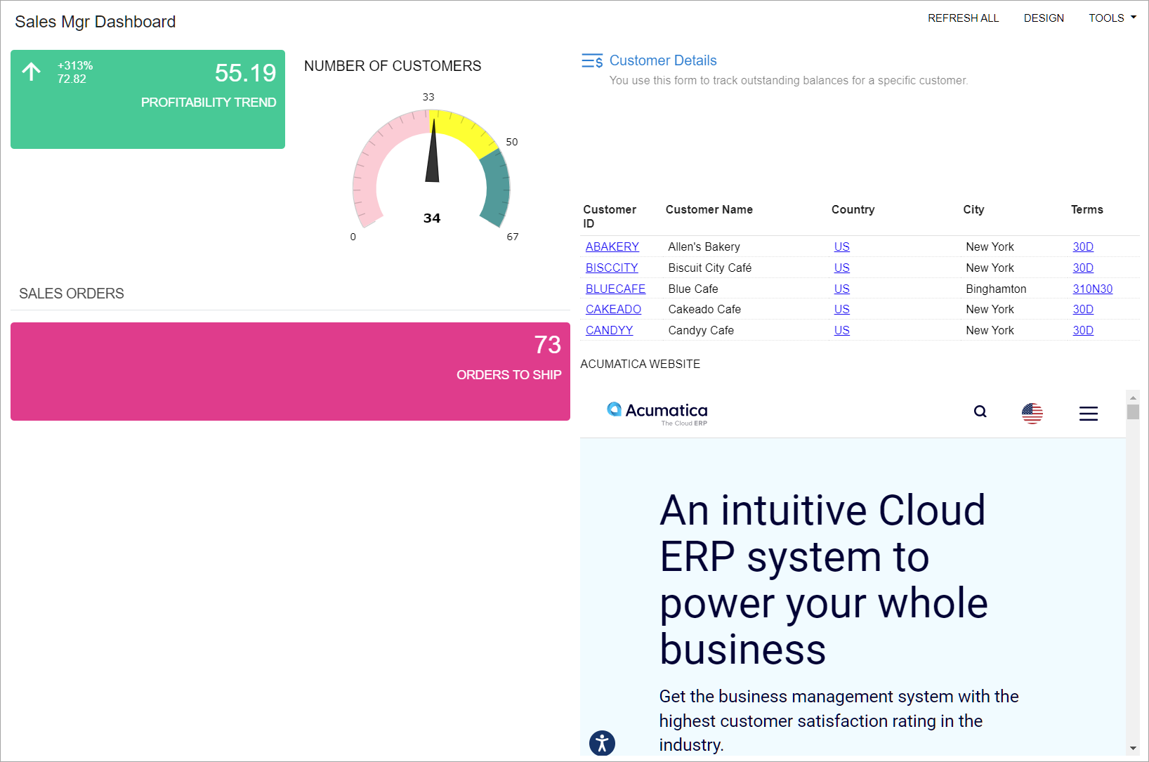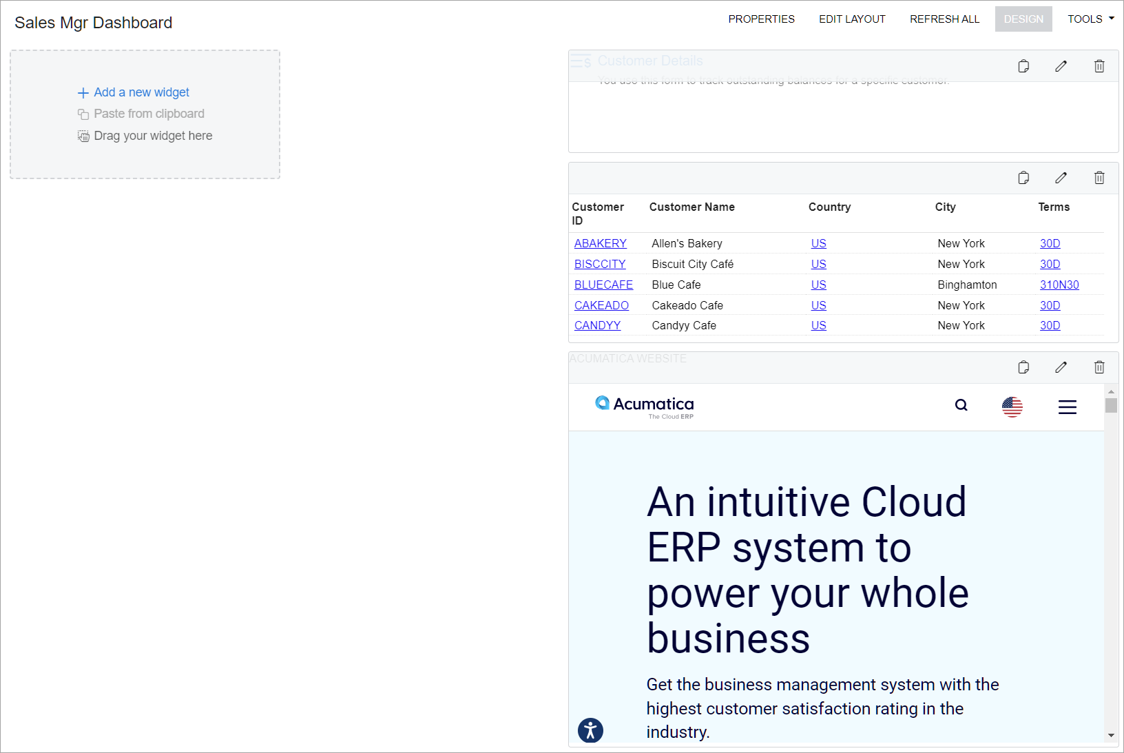 - While you are still in design mode of the Sales Mgr Dashboard dashboard, in the widget placeholder below the Sales Orders widget, click Add a new widget.