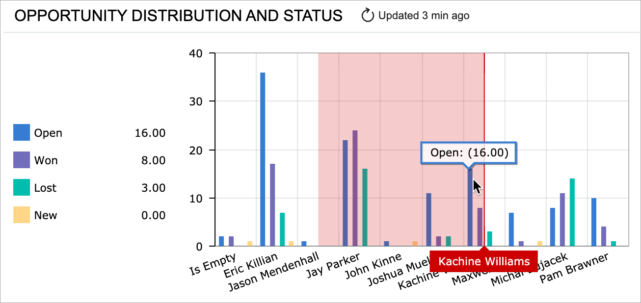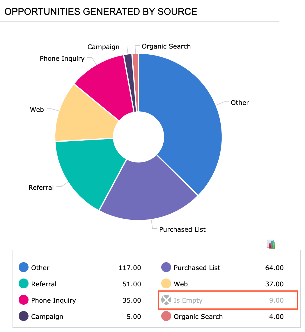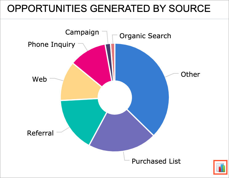 In a chart widget, the user can click a particular data point in the chart area, and the system opens the generic inquiry form with its results filtered according to the selected value. For example, suppose that in a doughnut chart that shows the number of opportunities generated by a source, the user clicks the sector that represents the number of opportunities generated by campaigns. In a new tab, the system opens the list of opportunities that have a campaign specified as the source.