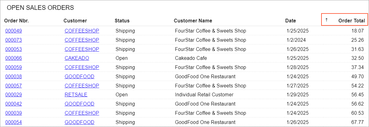 In a table widget, a user can sort data by a column in ascending or descending order. The user clicks the header of a column by which data in the table should be sorted. The system displays the sorting direction in the column header (see the following screenshot). To change the direction, the user clicks the header again. When the user clicks the header for the third time, the system clears the applied sorting and does not display the sorting direction.