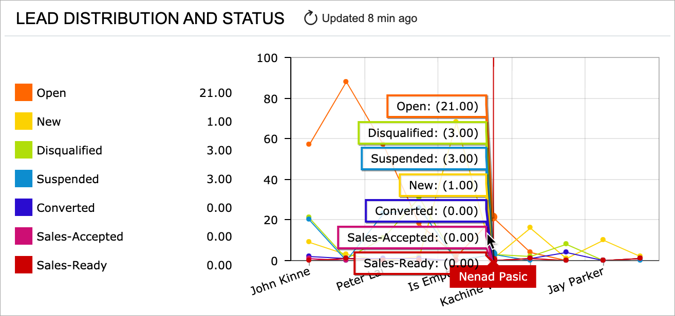 In a chart widget, a user can point to the desired legend item to view its details on the chart (see the following screenshot). If the legend of the chart is visible, the system duplicates the values of the selected point in the legend.