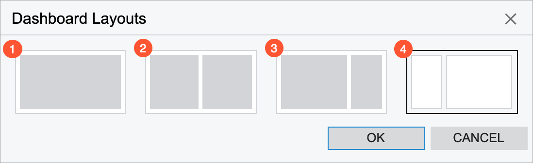 The first option (see Item 1 in the following screenshot) is a single working area in which you can arrange and resize widgets. The other three options (Items 2, 3, and 4) consist of two independent working areas of different sizes with some white space between them. You can move widgets between the working areas, but you can resize a widget only within a particular working area after you placed it in the area.