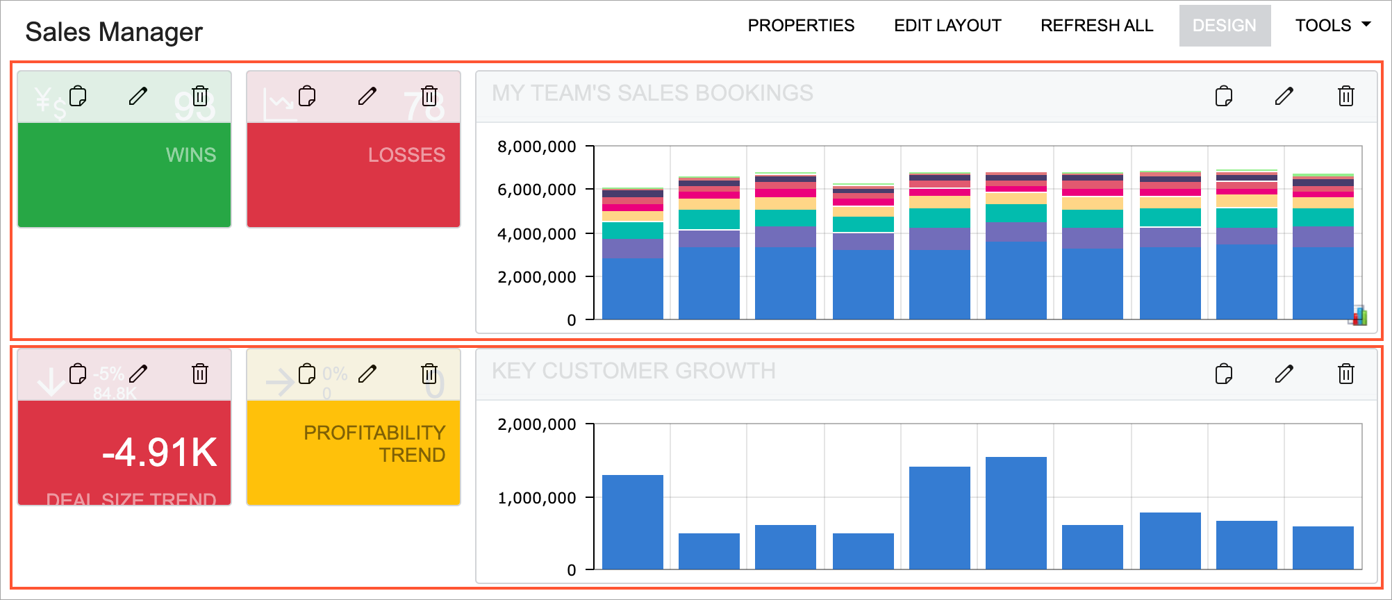 In most situations, we recommend using no more than 10 widgets, so that users can understand the data quickly and easily. On some dashboards, however, you may want to use more widgets so that users have immediate access to a variety of different information.