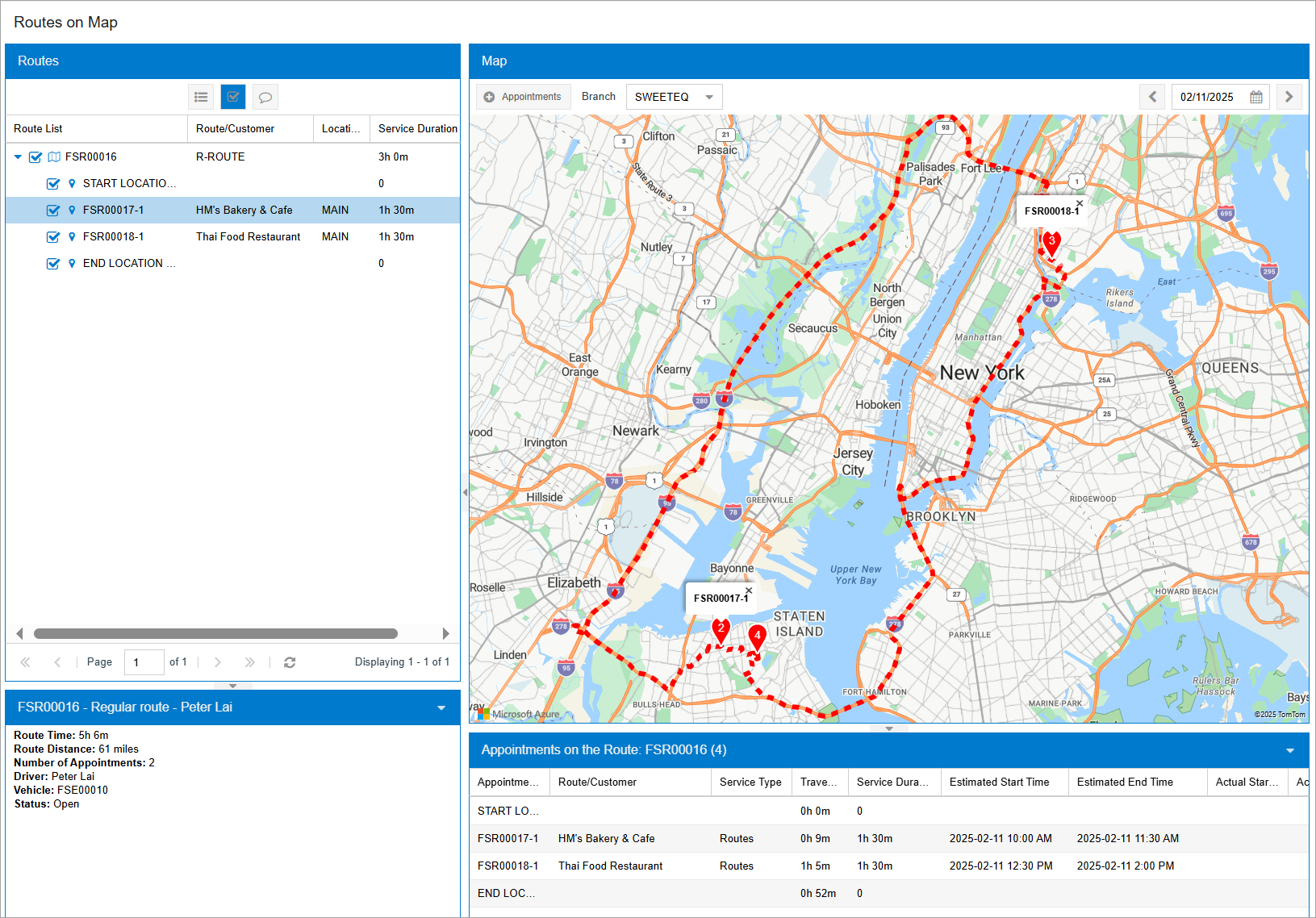 A service manager (Maia Davis) of the SweetLife Service and Equipment Sales Center analyzed the route execution dates, confirmed them with the customers, and decided to combine these route executions to be performed within one route execution because they were requested for the same day. Acting as this service manager, you will modify the date in the route execution that was previously created for the HM's Bakery & Cafe customer and add an additional appointment for the Thai Food Restaurant customer.