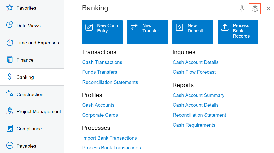 A tile is a special button on a workspace that a user clicks to open a form or report with predefined settings (or, for a data entry form, with most settings blank so that a user can define a new record). For example, a tile could be added that a user can click to open the Cash Transactions (CA304000) form to create a new cash entry.