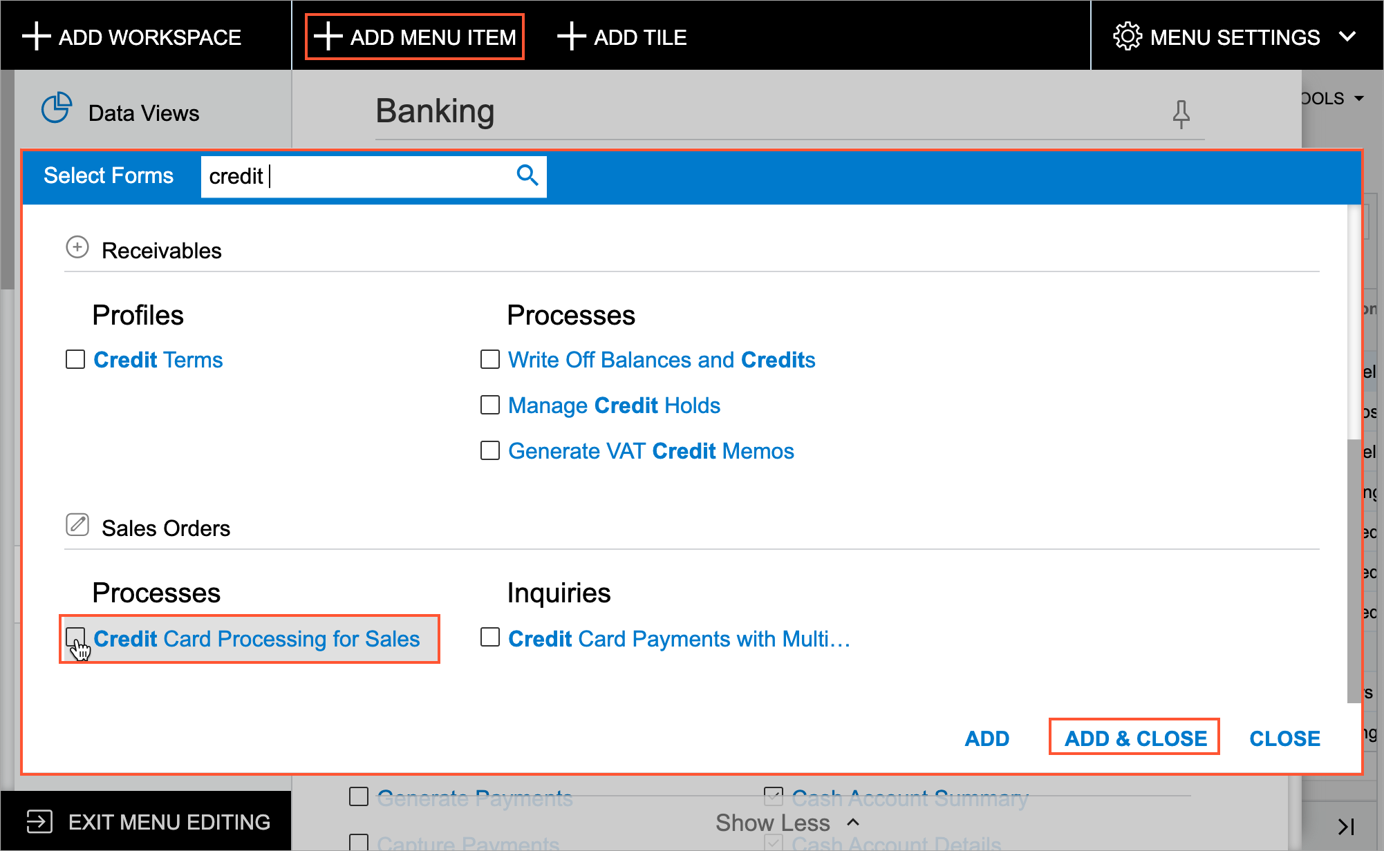 In Menu Editing mode, you open the needed workspace. You click Add Menu Item on the top toolbar. In the Select Forms dialog box, which opens, you search for the needed form, report, or dashboard by typing its name or identifier in the Search box. To add the item, you select the check box next to it and click Add and Close to exit the dialog box (see the following screenshot).