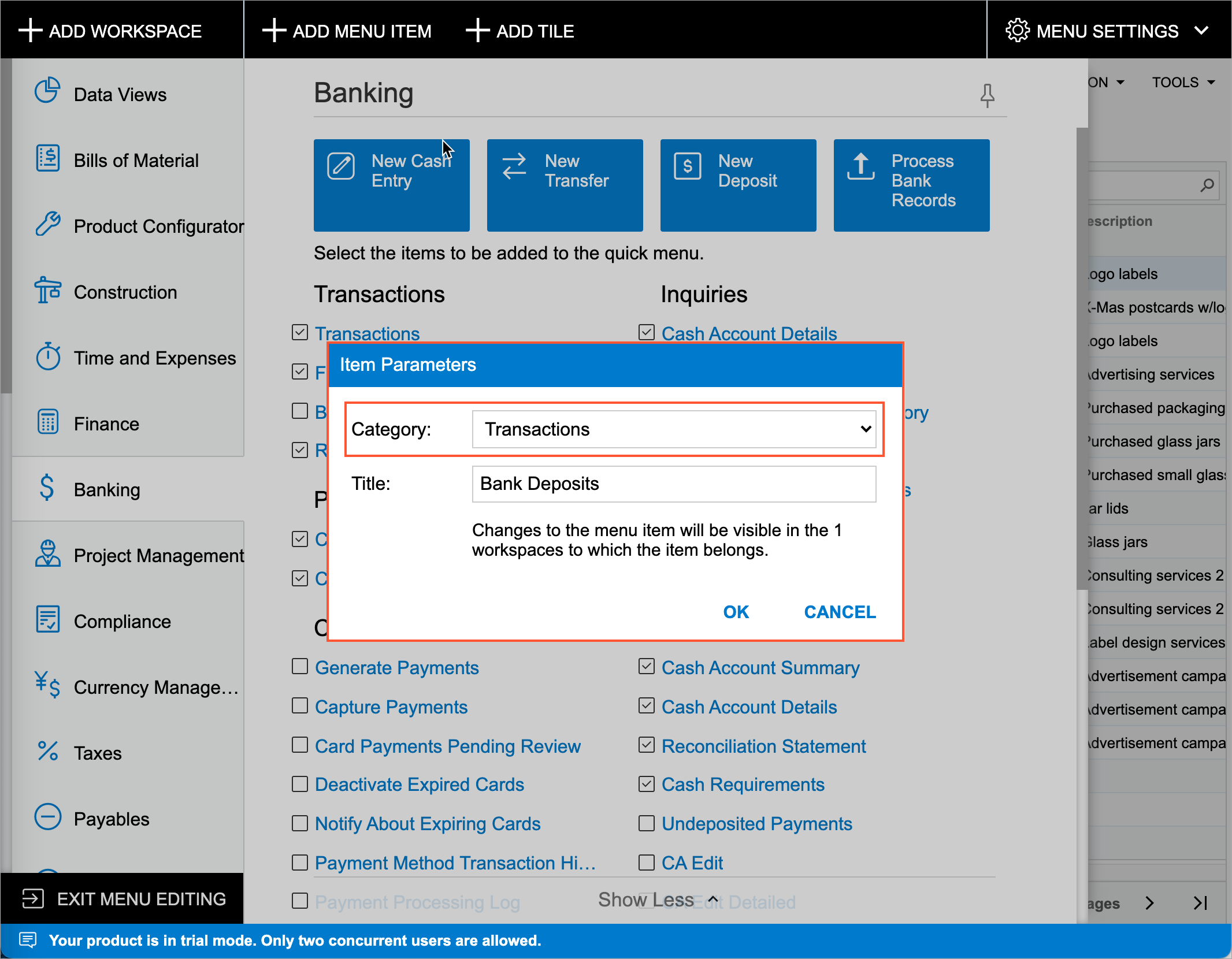 You can also reorder the tiles in a workspace. To do this, in Menu Editing mode, you drag any tile to the needed position.