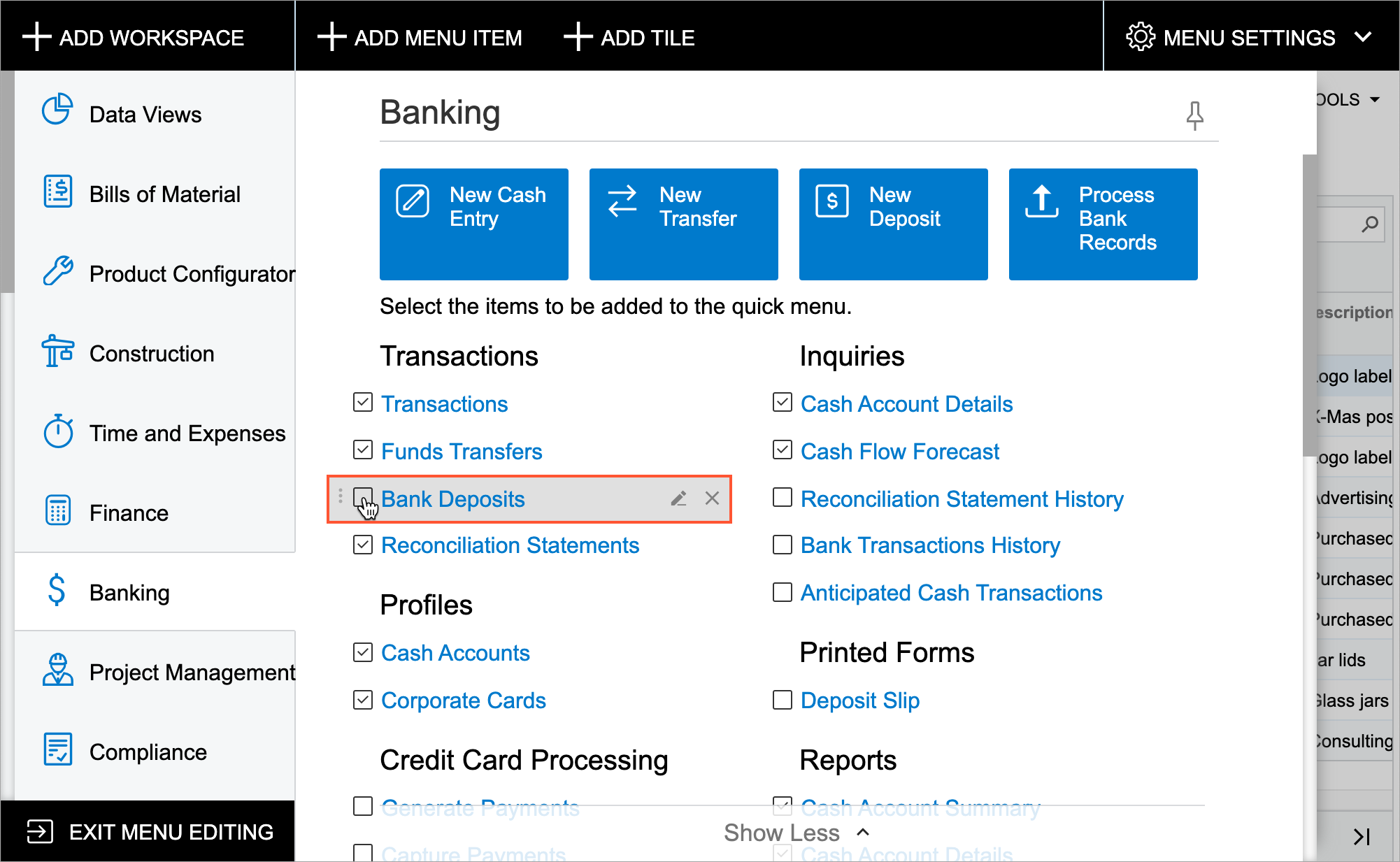 In this mode, they can select check boxes for the forms, reports, and dashboards whose links will be displayed on the quick menu (and clear check boxes for items to not be displayed).