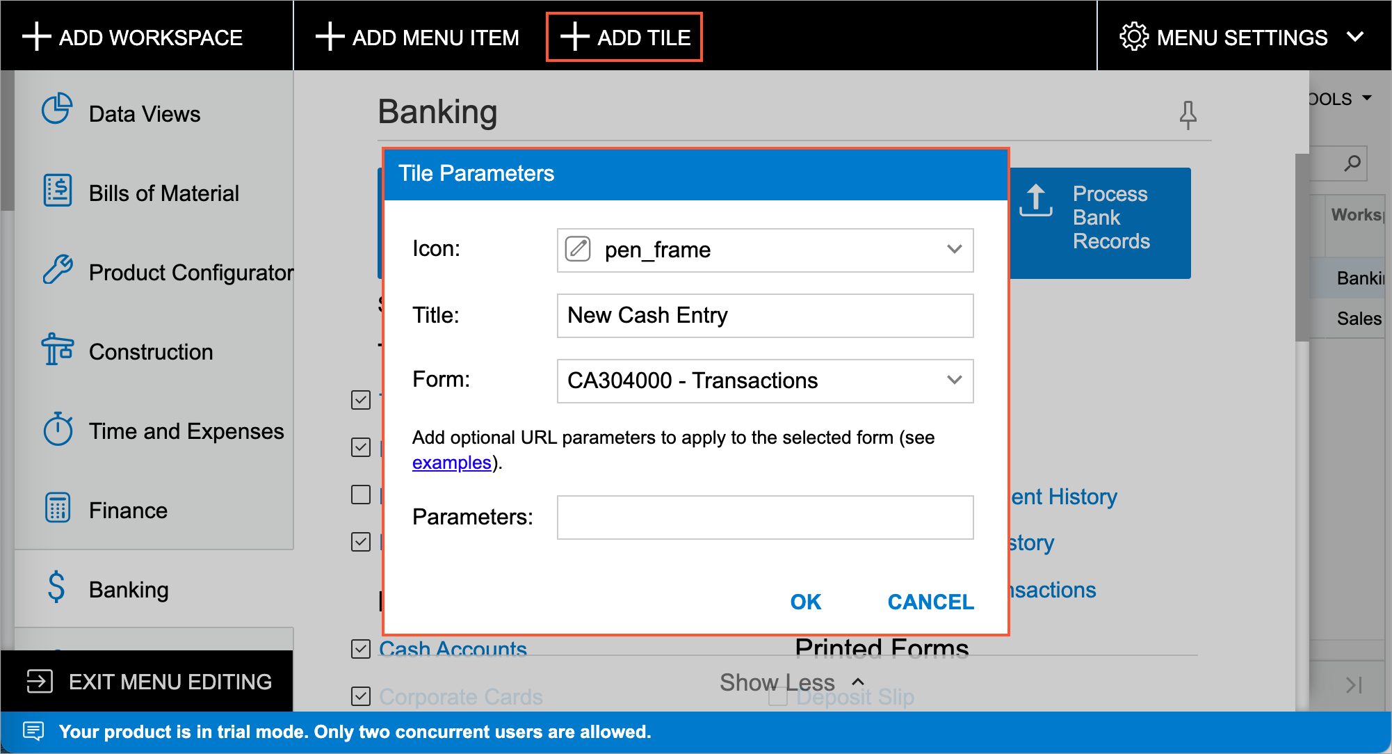 To create a tile, you switch to Menu Editing mode and open the needed workspace. You click Add Tile on the top toolbar, and the system opens the Tile Parameters dialog box. In the dialog box, you specify the icon and title to be displayed on the tile, as well as the form that the system should open when a user clicks the tile (see the following screenshot). You can also add tile parameters, as described in the next section. You then click OK to close the dialog box and add the tile.
