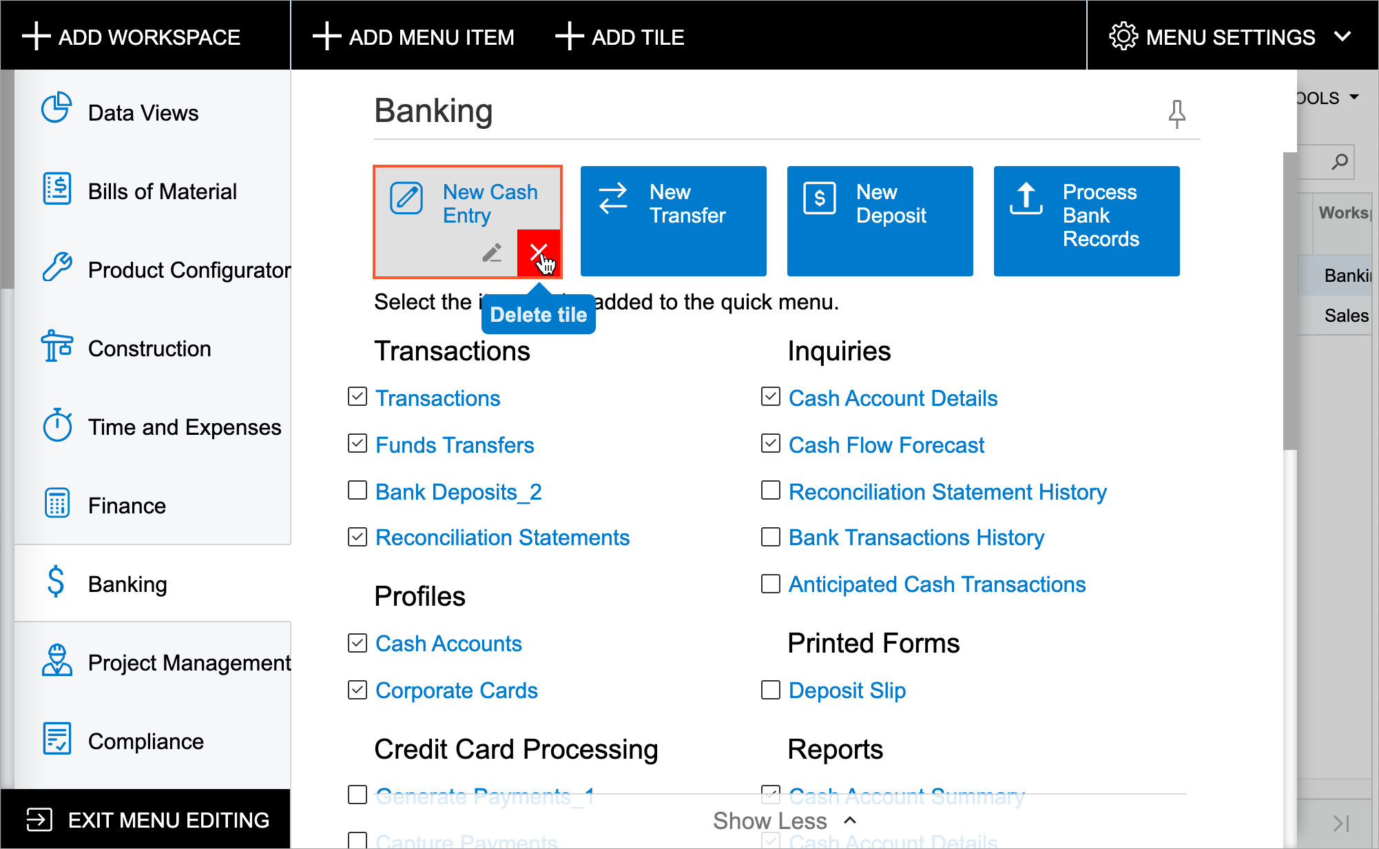 any tile from a workspace. To delete a tile, you switch to Menu Editing mode, open