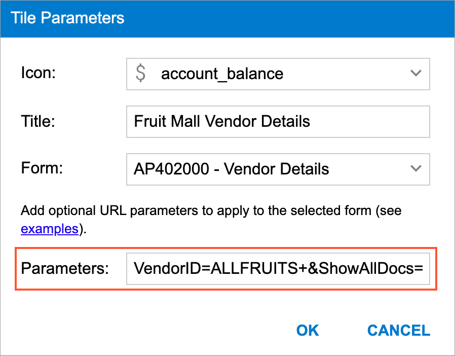 To indicate the elements and values that need to be provided to the system when a user clicks the tile, you specify fields and their values as URL parameters in the Tile Parameters dialog box for the tile. You can add multiple parameters separated by &.
