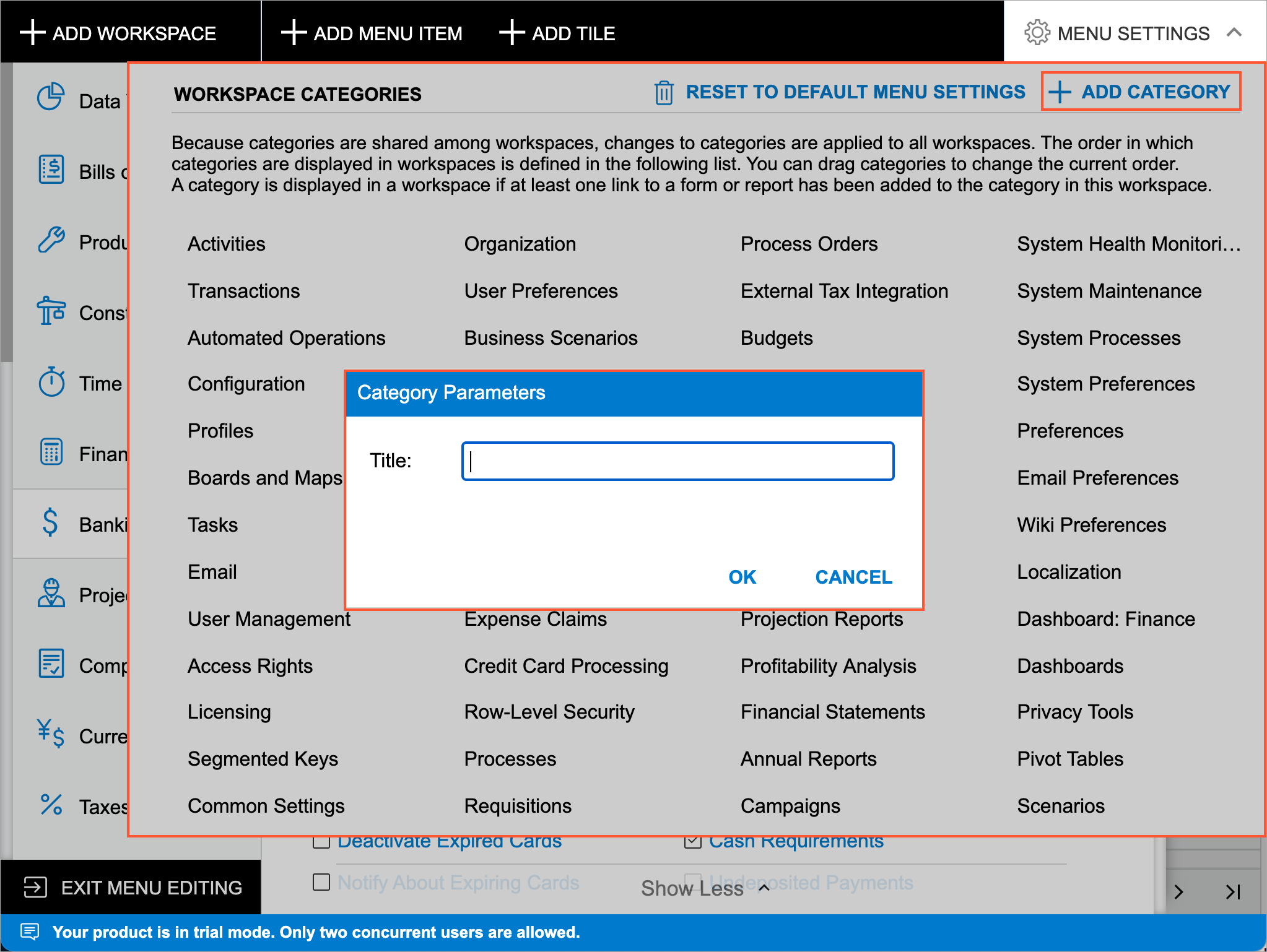 In a workspace, the links to the forms, reports, and dashboards are grouped by categories. In Menu Editing mode, you can review the list of available categories by clicking Menu Settings in the upper right corner to open the Workspaces Categories menu. Because categories are shared among workspaces, changes to categories are applied to all workspaces. The order in which categories are displayed in workspaces is defined in this list. You can drag categories to change their order. A category is displayed in a workspace if at least one link to a form or report has been added to the category in this workspace.