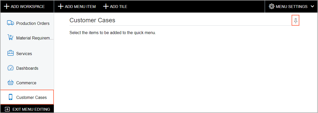 Figure 2. The new tile on the Customer Cases workspace in Menu Editing mode