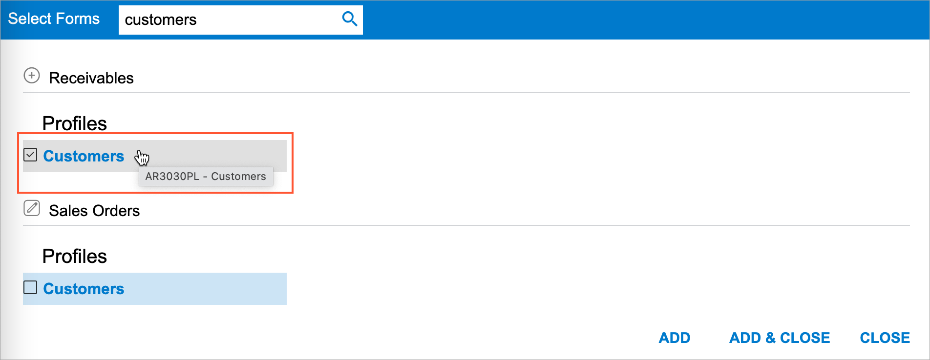 the Customers (AR3030PL - Customers) item in the