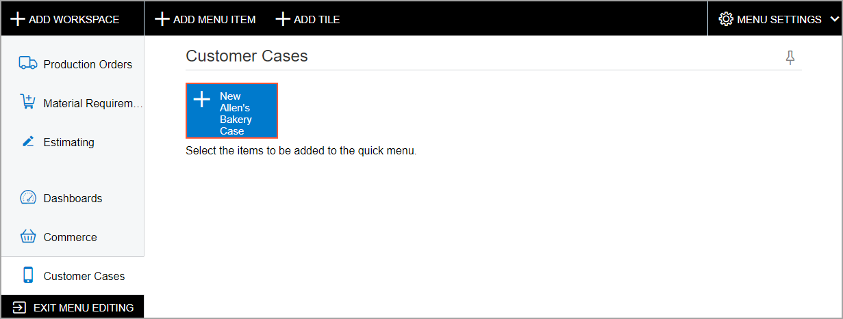 You will switch to Menu Editing mode and will create the Customer Cases workspace. You will add the New Allen's Bakery Case tile to the workspace. Then you will add links to the Customers and Cases forms to this workspace.