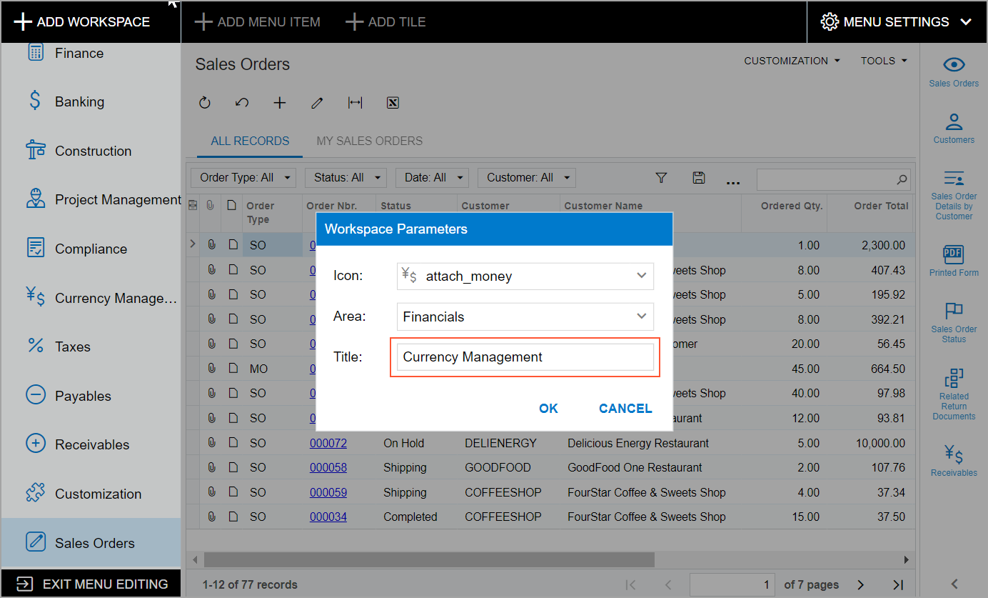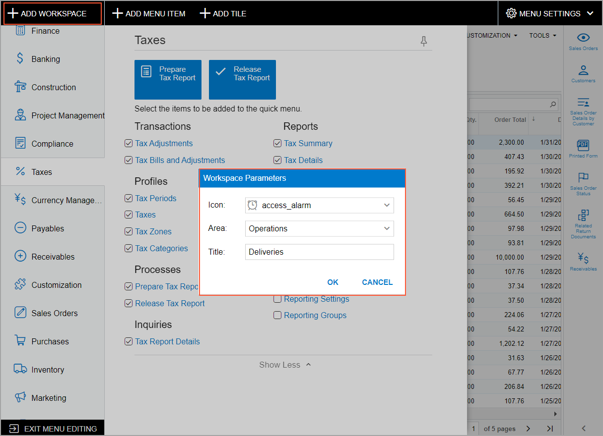 If your organization has a specific business process that requires forms, reports, and dashboards from different functional areas to be gathered on one workspace for employees' convenience, you can create a custom workspace and pin it to the main menu panel.
