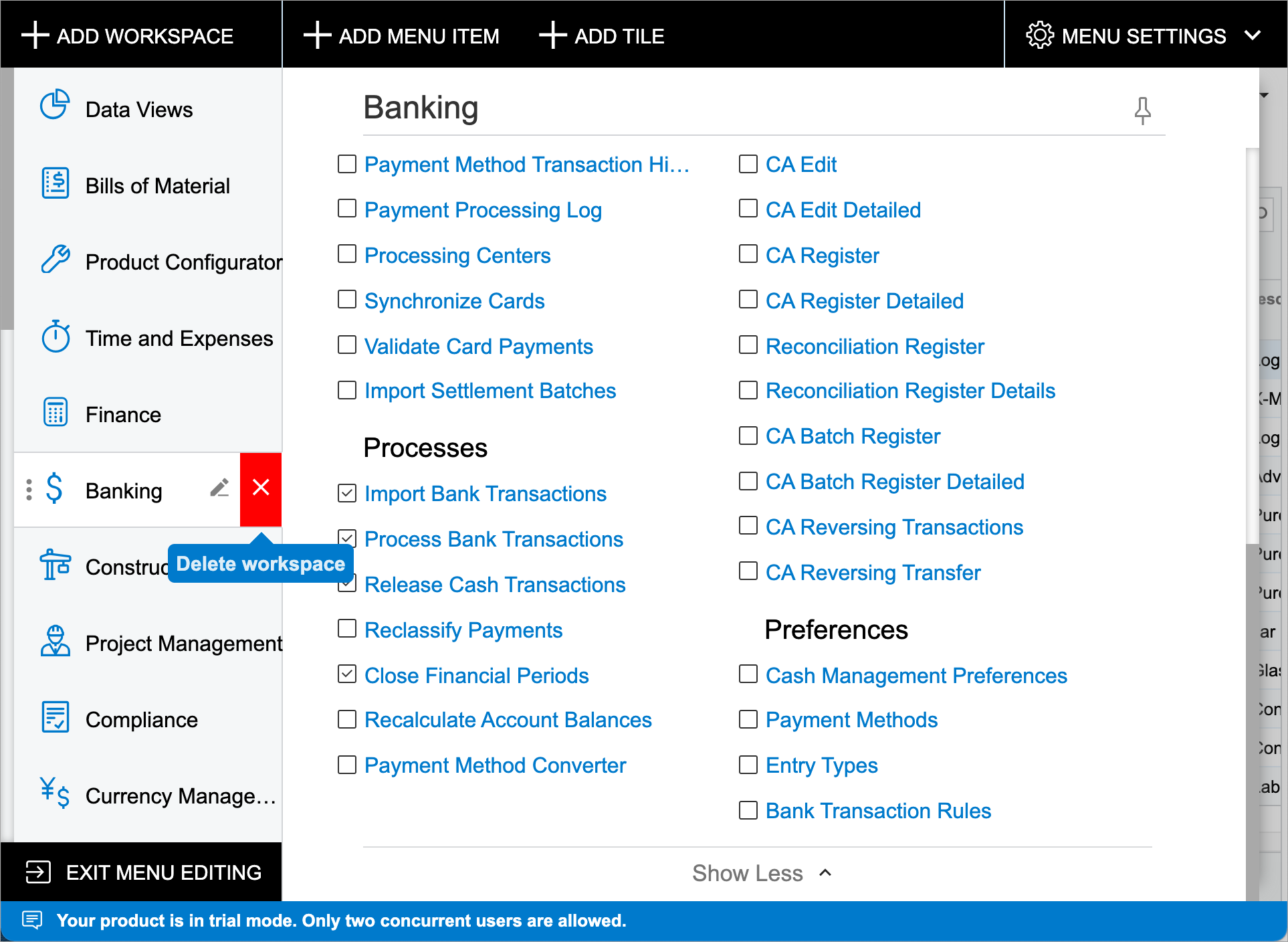 If a predefined workspace does not fit the business processes of your organization and will never be needed by system users, you can remove it from the main menu, including from the More Items menu. When you remove a workspace, the system deletes the tiles that belonged to the workspace, but the forms, reports, and dashboards that belonged to the workspace remain in the system. You can add to other workspaces links to these forms, reports, and dashboards.