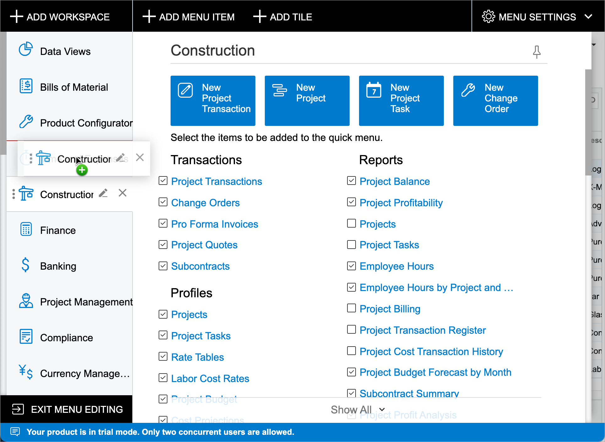- To pin a workspace and move it to the main menu, you switch to Menu Editing