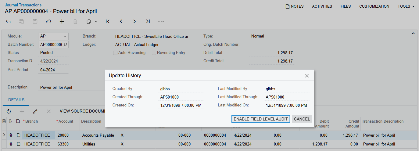Also, you will view general information about a journal transaction by using the Audit History command on the Journal Transactions (GL301000) form, for which auditing has not been configured.