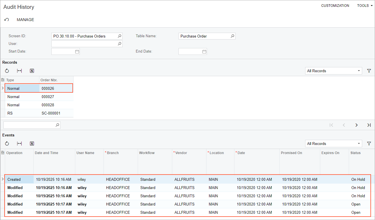 Then you will open the Audit History (SM205530) inquiry form and view the audit trails recorded for the changes made to the documents on the Purchase Orders (PO301000) form.