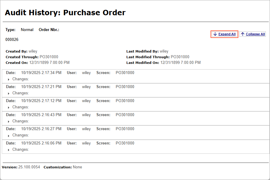 You will use the Purchase Orders (PO301000) form to view the 000026 purchase order. With this document selected on the form, you will click on the form title bar to open the Audit History page in a new tab, where you can see the list of changes made to the selected document.