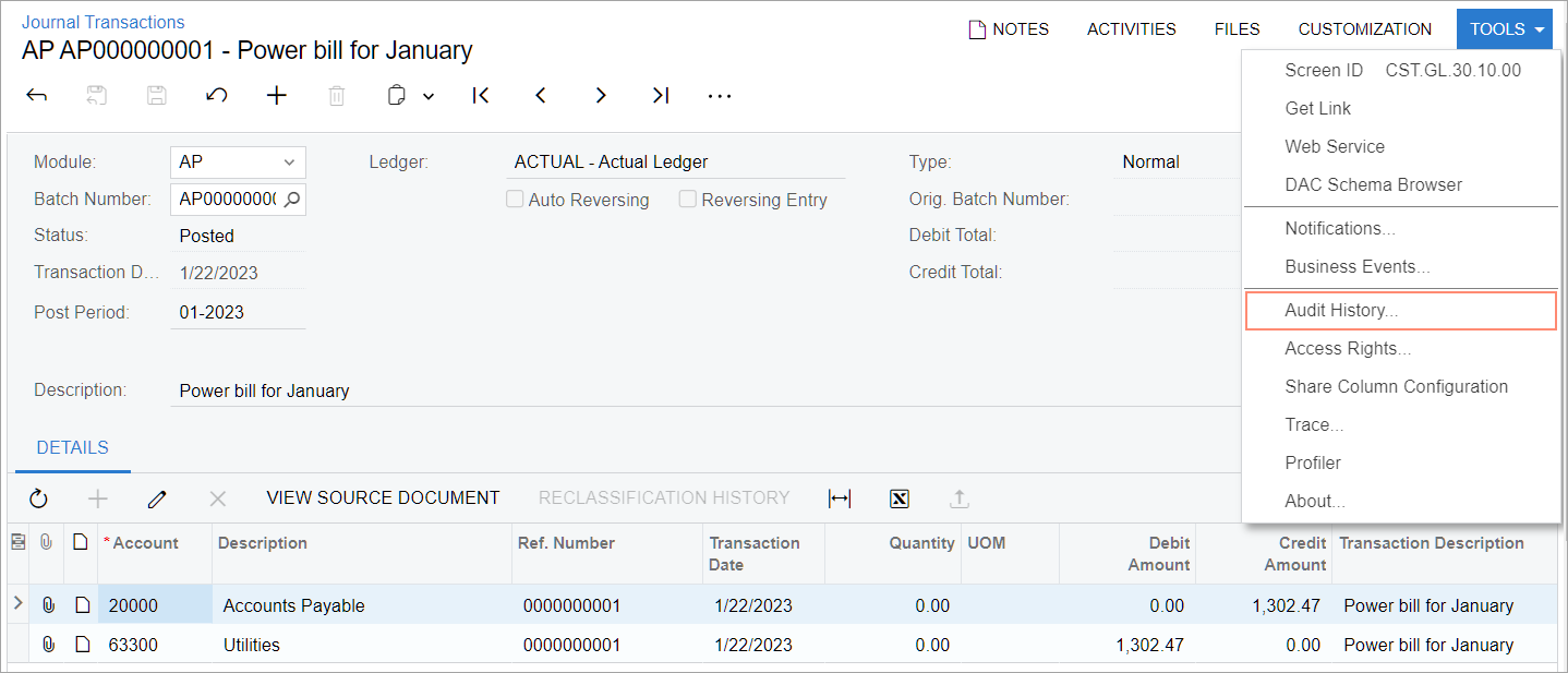 Field-level auditing is configured on a per-form basis. A form supports this auditing if the Audit History menu command is available on the Tools menu of the form title bar, as demonstrated in the following screenshot. If the Audit History command is not shown, the selected form does not support field-level auditing.