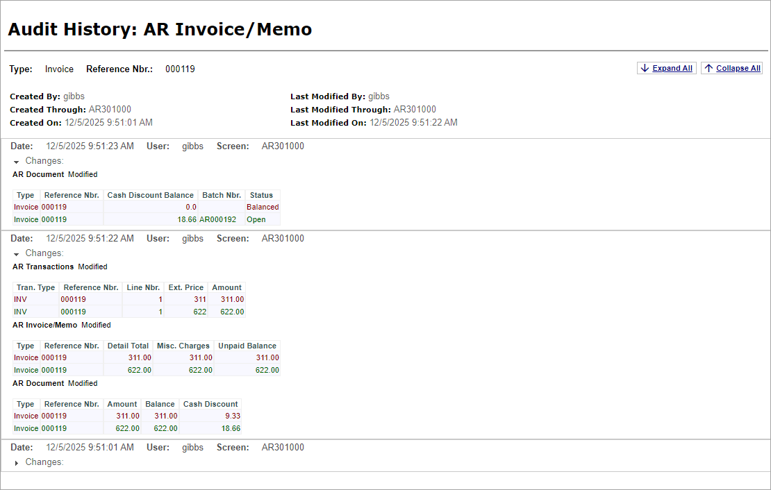 To review the auditing of changes for the invoice on the Invoices and Memos (AR301000) form, do the following: