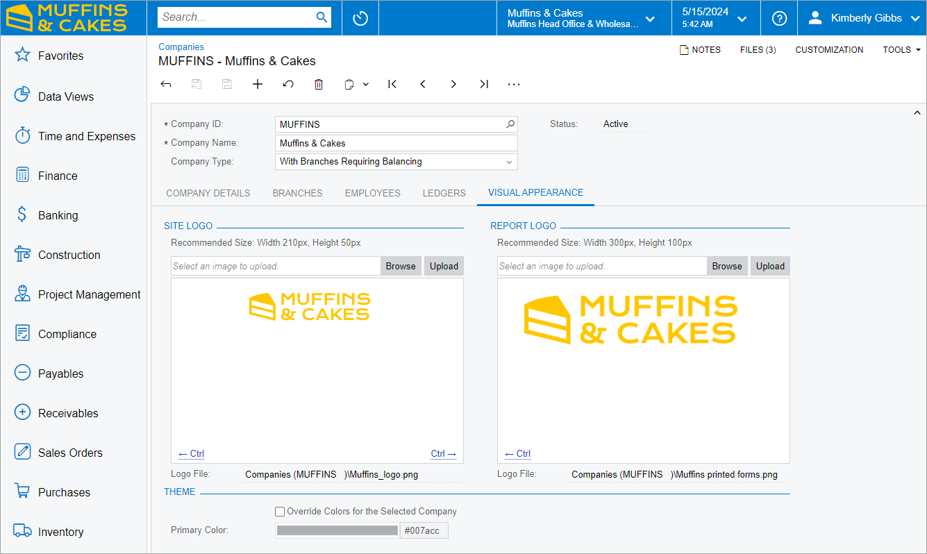 In this activity, on the Companies (CS101500) form, you will specify the company logo of the Muffins & Cakes company, which will be displayed in the upper left corner of MYOB Acumatica for all branches of the company.
