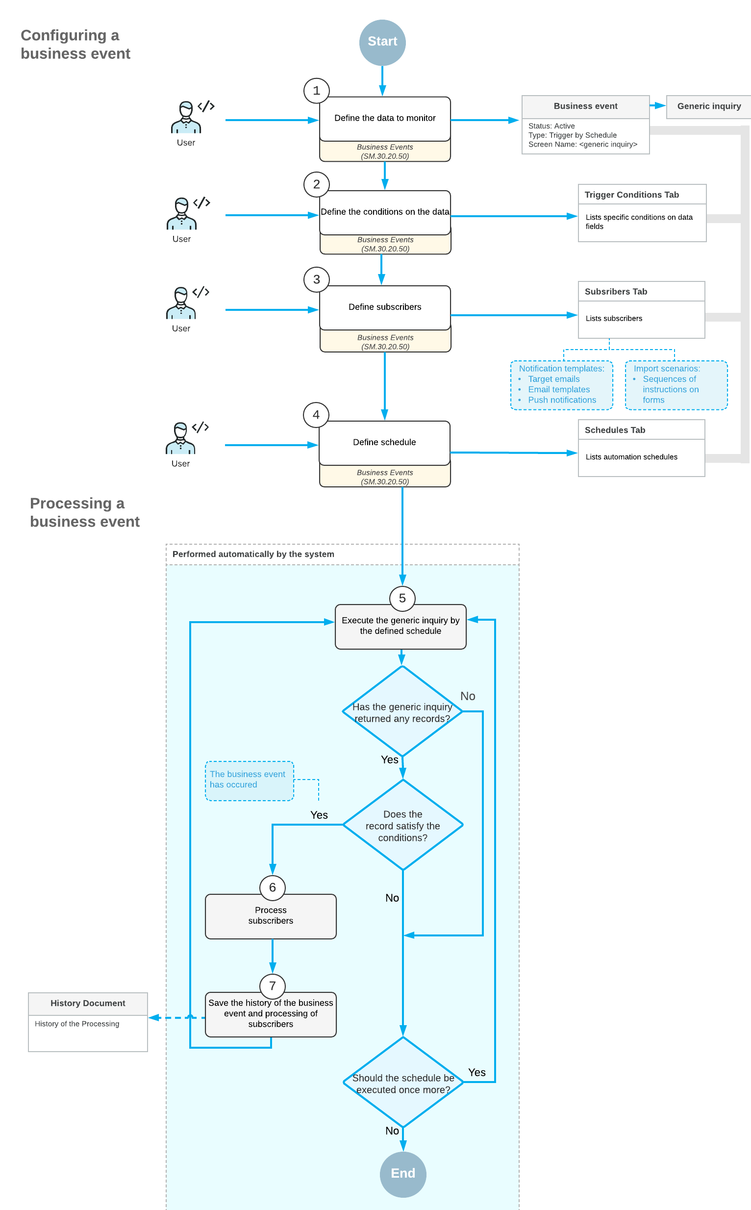 The following diagram shows how business events checked for on a schedule are configured and processed.