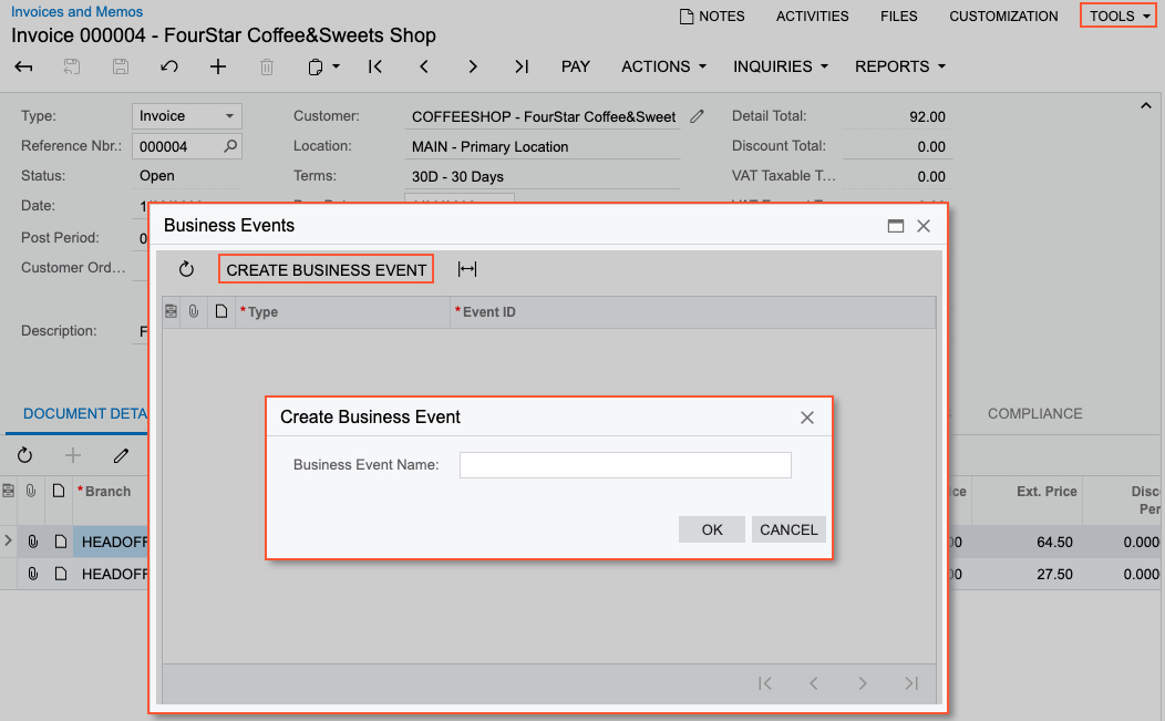 In the Business Events dialog box, which opens, you click Create Business Event, enter the name of the event in the dialog box, and click OK (as shown in the following screenshot). The system opens the Business Events (SM302050) form with the data entry form selected as a data source.