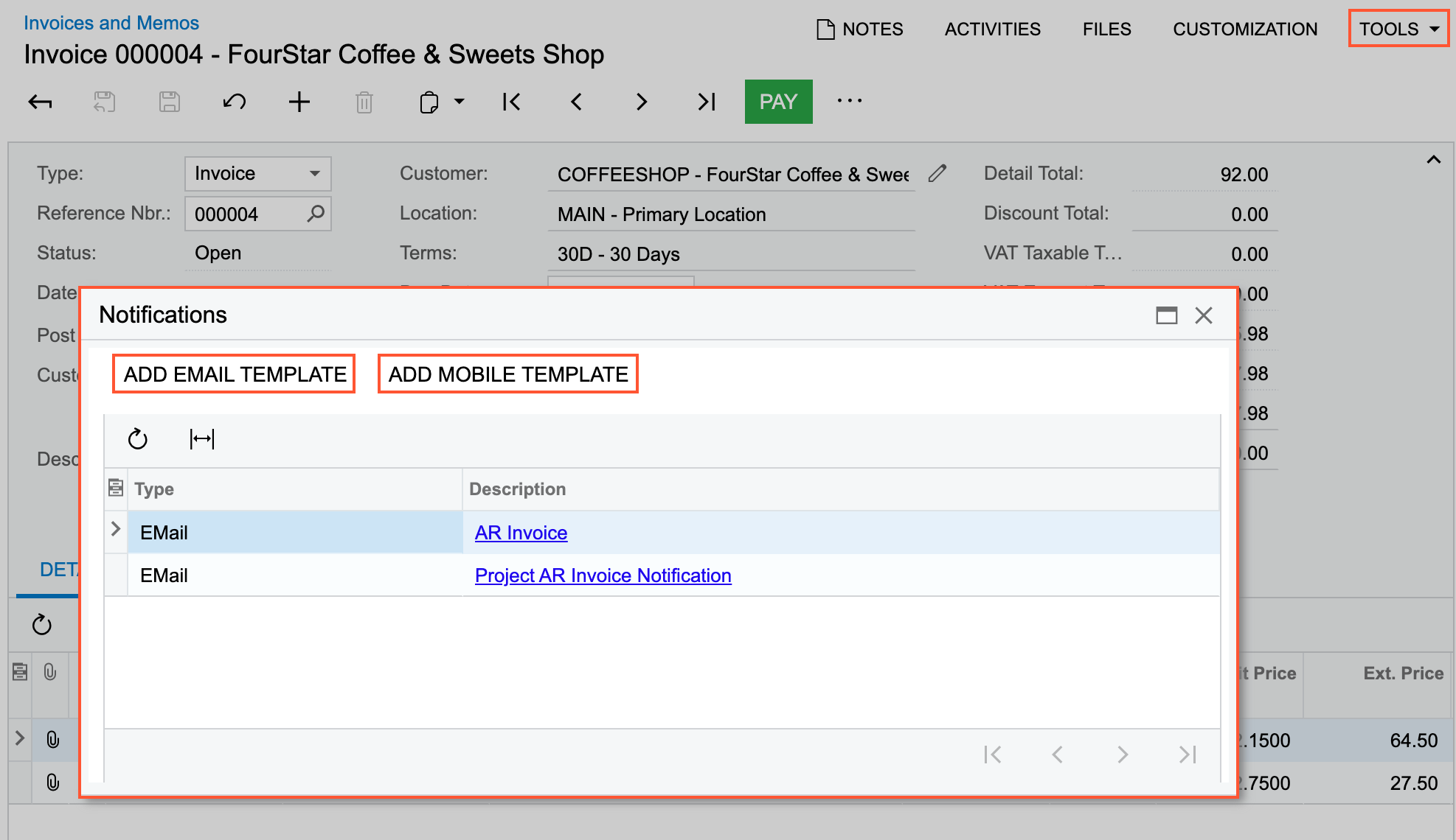 In the Notifications dialog box, which opens, you can click Add Email Template or Add Mobile Template to create a notification template. The system opens either the Email Templates (SM204003) form or the Mobile Notifications (SM204004) form with the data entry form selected in the Screen Name box. On the Mobile Notifications (SM204004) form, you will need to select the delivery method (Push or SMS).