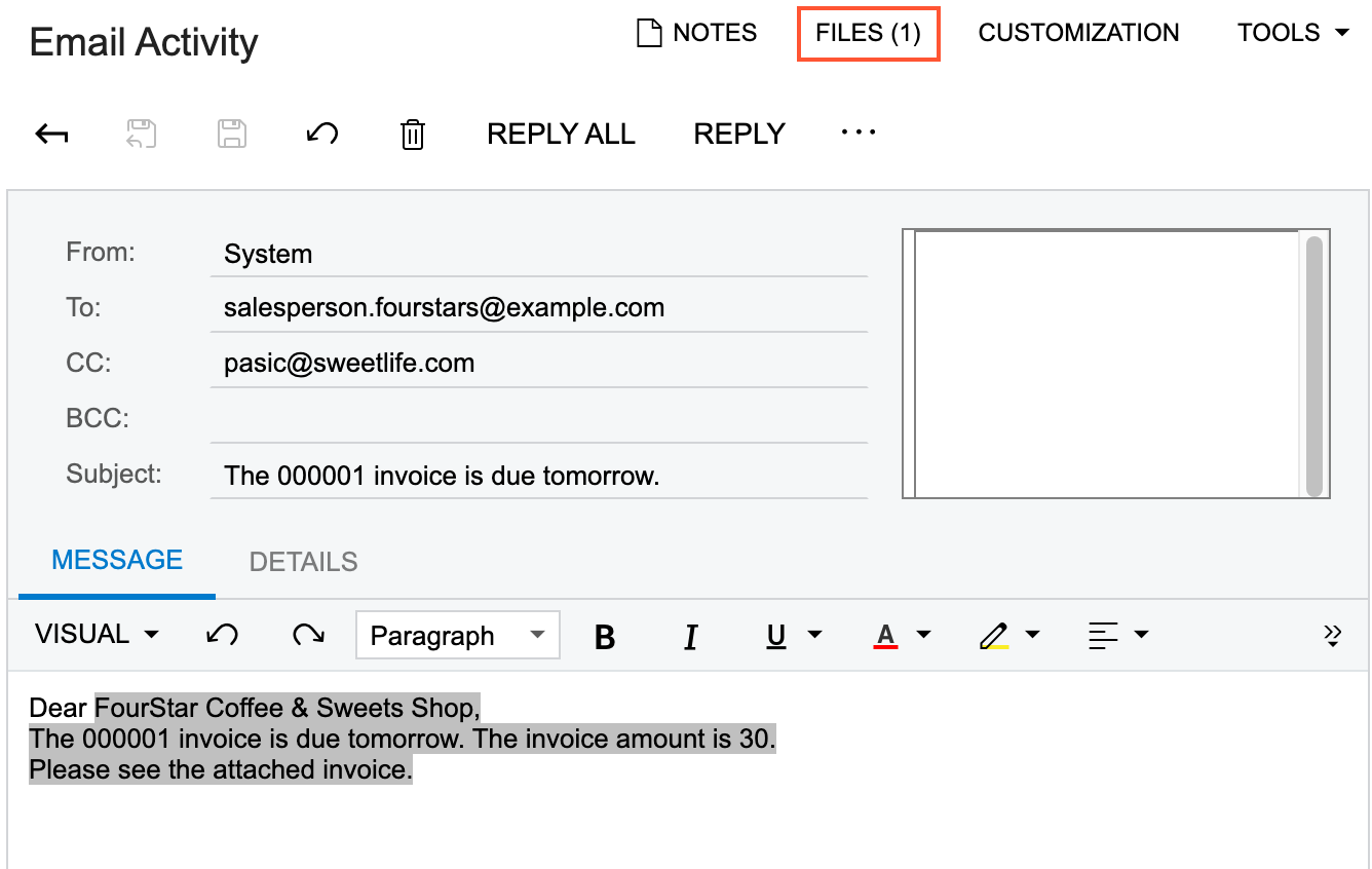 To verify that the business event works correctly, you will change a due date of an invoice to tomorrow. After the system executes the inquiry based on the specified schedule, you will verify that the notification email appears on the All Records tab of the All Emails (CO409070) form. Also, you will sign in as the owner of the invoice and verify that the related task appears on the My Tasks tab of the Tasks (EP4040PL) form.