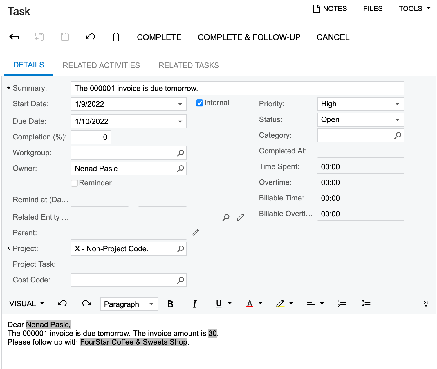 - On the My Tasks tab of the form, locate the record with The 00001 invoice is due tomorrow in the Summary column.
