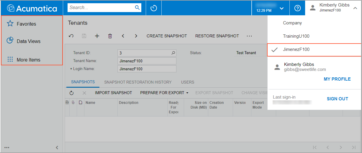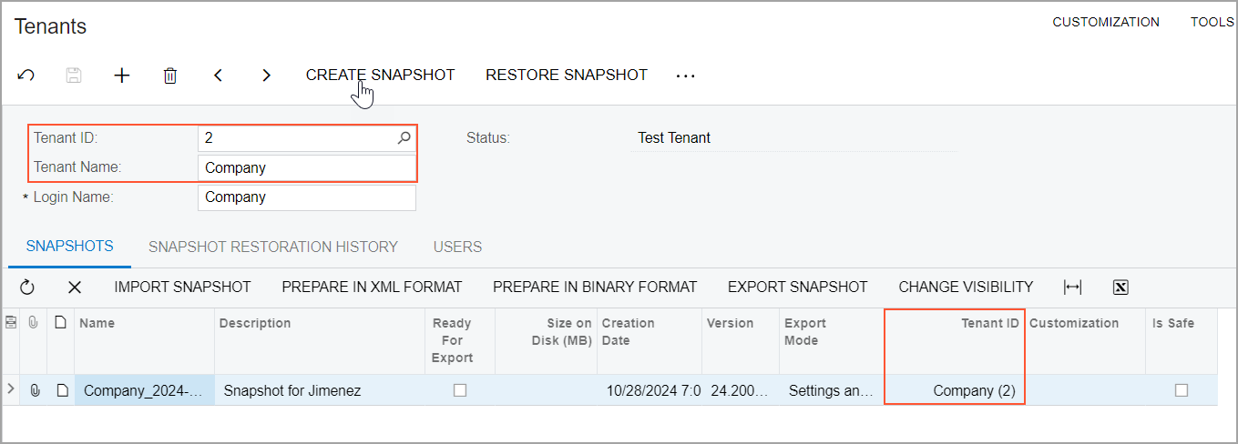 - While you are still on the Tenants (SM203520) form, in the Tenant ID box, select the ID of the JimenezF100 tenant. The snapshot with the Snapshot for Jimenez description is still displayed for this tenant on the Snapshots tab because you have increased the visibility for this snapshot.