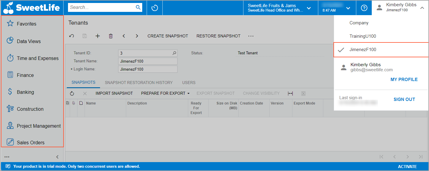 Suppose that the SweetLife Fruits & Jams company has a new hire, Alberto Jimenez, who should complete a training course during his probation period. To complete the training, the new employee needs a copy of the production tenant. Acting as a system administrator, you need to create a test tenant for the new employee. To save space, you will take a snapshot whose content is limited to the settings and business accounts of the production tenant, instead of copying all production data of the tenant. You will toggle the visibility of the snapshot and restore this snapshot for the test tenant. Then you will delete the snapshot.