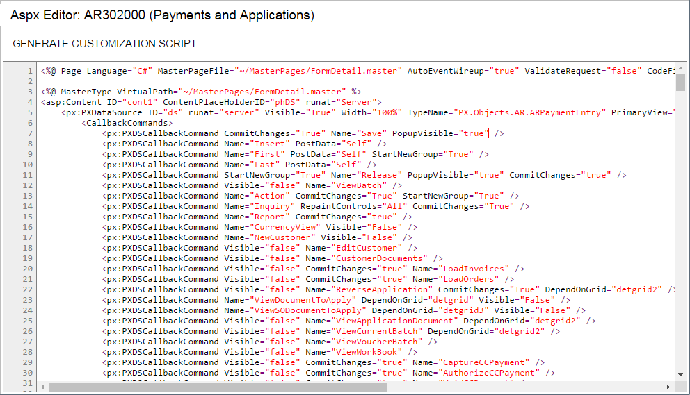 You use the ASPX Editor page to edit the ASPX code of the particular screen (that is, the form in MYOB Acumatica) that you are customizing by using the Screen Editor page.