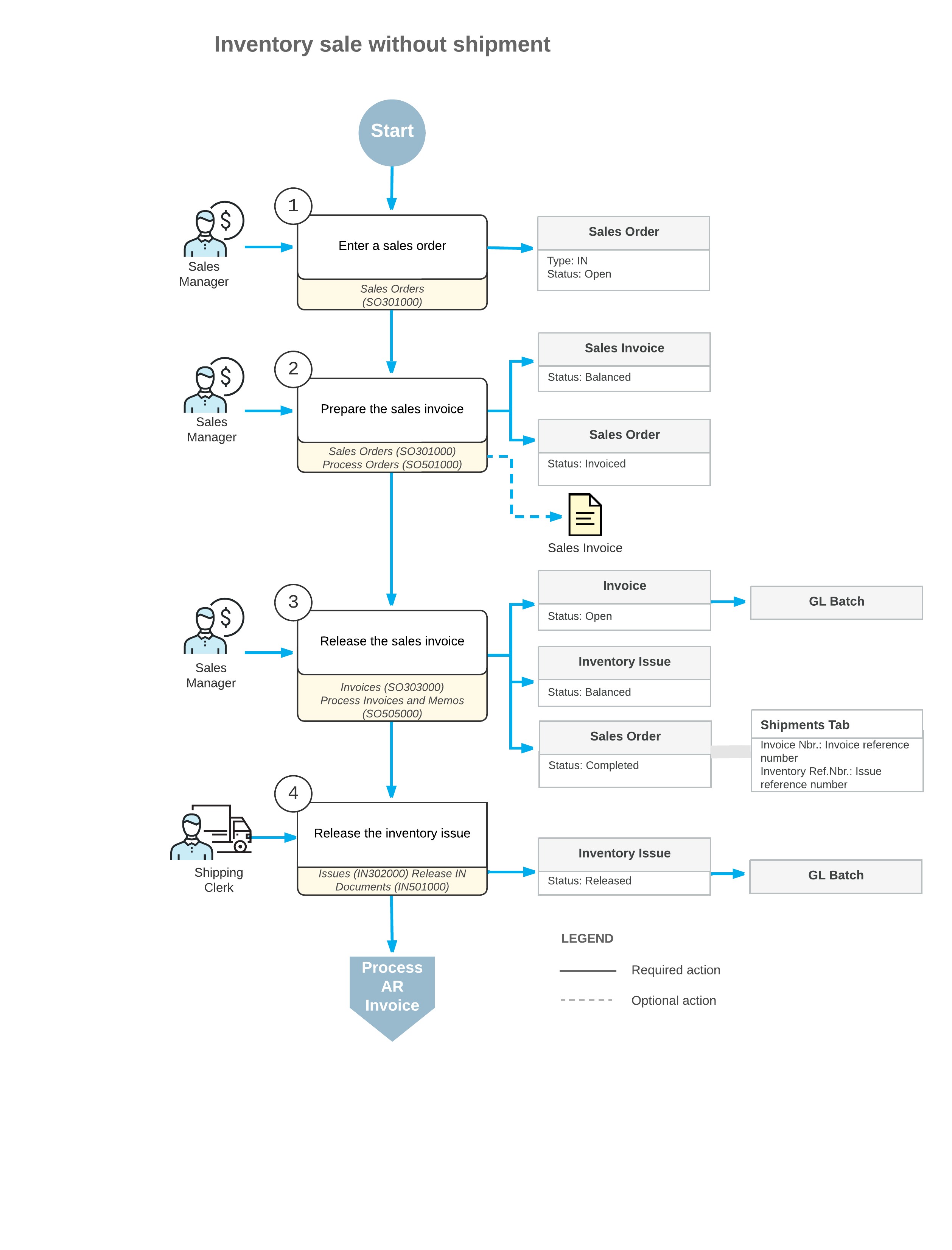 An invoice order, which has the IN order type selected on the Sales Orders (SO301000) form, is a special type of sales order that you create when the goods requested by a customer have been shipped or delivered already, and thus the order does not require a shipment to be processed. The processing of an invoice order involves the actions and generated documents shown in the following diagram.