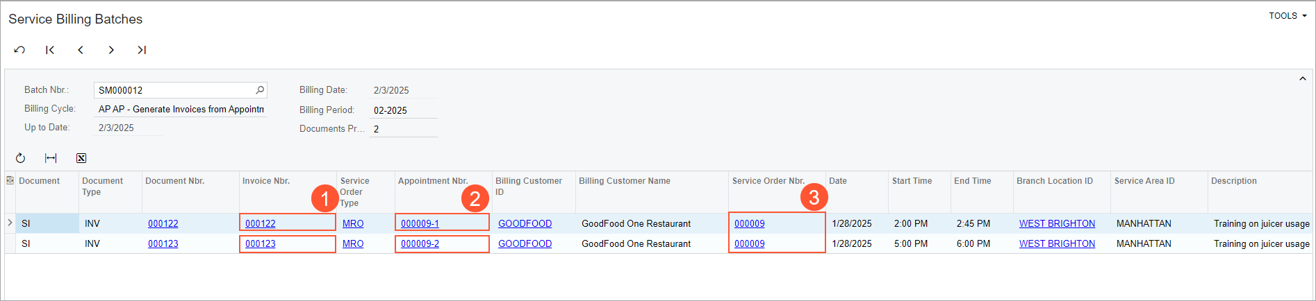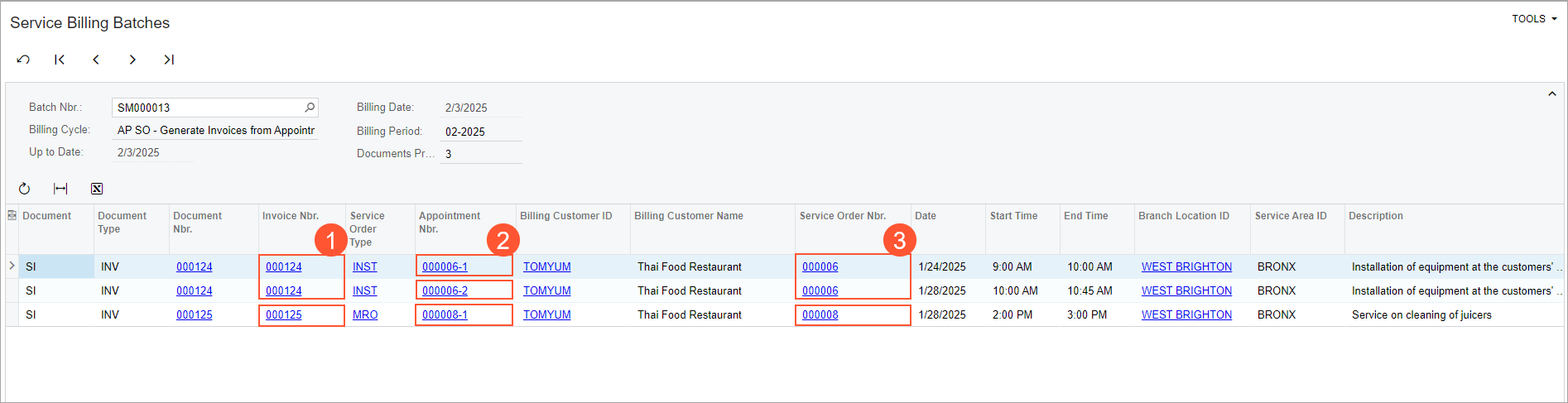 for TOMYUM (Thai Food Restaurant).The Service Billing Batches form opens in a pop-up window with the batch of generated invoices. Notice that two invoices (see Item 1 in the following screenshot) have been generated for three appointments (Item 2) of two service orders (Item 3). This is because the billing cycle of the customer has been defined to run billing for appointments and group them by service orders.