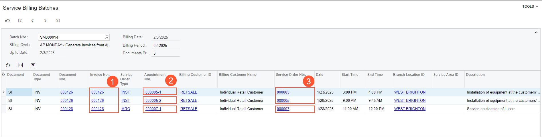 The Service Billing Batches (FS305800) form opens in a pop-up window with the batch of generated invoices. Notice that a separate invoice (Item 1 in the following screenshot) has been generated for each appointment (Item 2) of one service order (Item 3). This is because the billing cycle of the customer has been defined to run billing for appointments and group them by appointments.