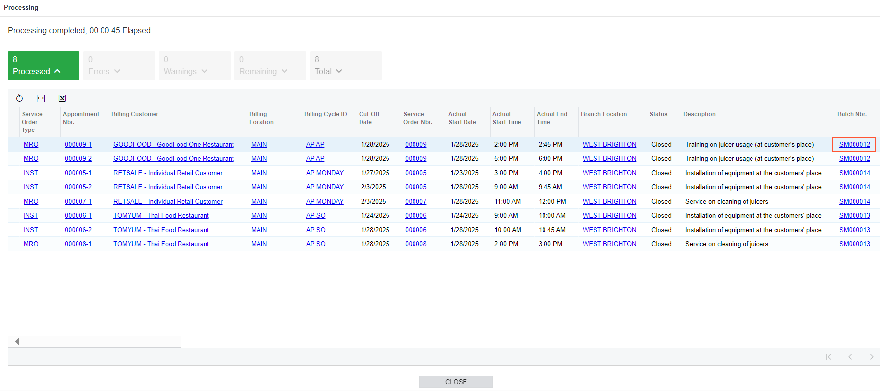 In the table, notice that for GOODFOOD, two appointments of one service order have been closed on 1/28/2025. For RETSALE, two appointments of one service order have been closed, and one appointment of another service order has been closed during the past week. For TOMYUM, the last appointment of a service order has been closed on 1/28/2025. In the Cut-Off Date column, you can see the date when the billing document can be generated for each appointment. This date is computed based on the actual completion date of the appointment, and the billing date is based on the customer's billing cycle.