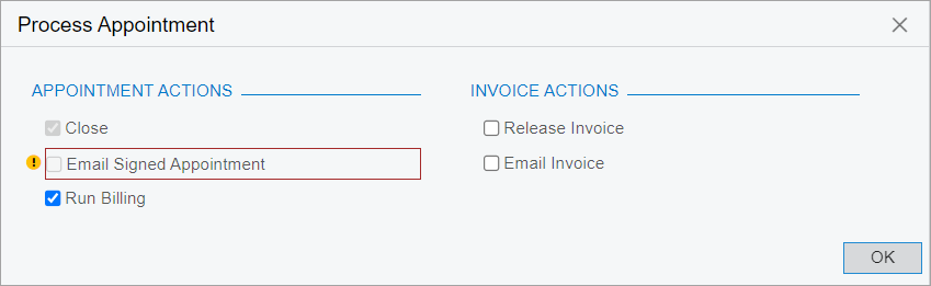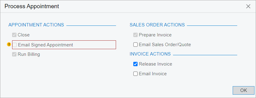 In MYOB Acumatica, you can initiate the quick processing of an appointment—that is, performing such actions on the appointment as closing an appointment, preparing and releasing billing documents, and emailing the billing documents to the customer—with just one click.