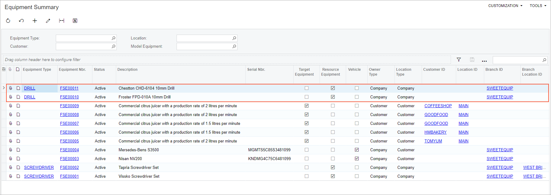 On the Equipment (FS205000) form, you will create two equipment records. You will then make sure that the records are displayed on the Equipment Summary (FS400200) form
