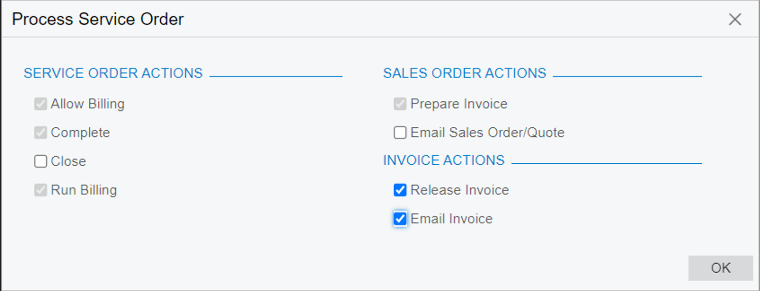 When sales orders are generated during billing, quick processing is also affected by the settings of the sales order type associated with the sales order, which is selected in the Order Type for Billing box of the Service Order Types form. If the Allow Quick Process check box is selected on the Template tab on the Order Types (SO201000) form for the order type, then the Use Sales Order Quick Processing check box is available in the Sales Order Actions section of the Process Service Order dialog box. When a user selects this check box, the Prepare Invoice check box disappears in the dialog box.