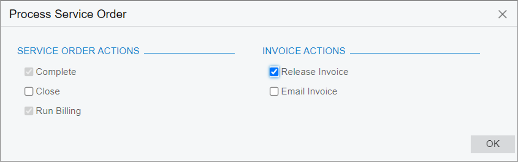 When you click Quick Process on the Service Orders form, the system opens the Process Service Order dialog box with the specific set of available actions and the default settings based on the service order type assigned to the service order being processed. In this dialog box, you can select additional actions to be performed, or clear the check boxes for the actions selected by default that you do not want to perform.