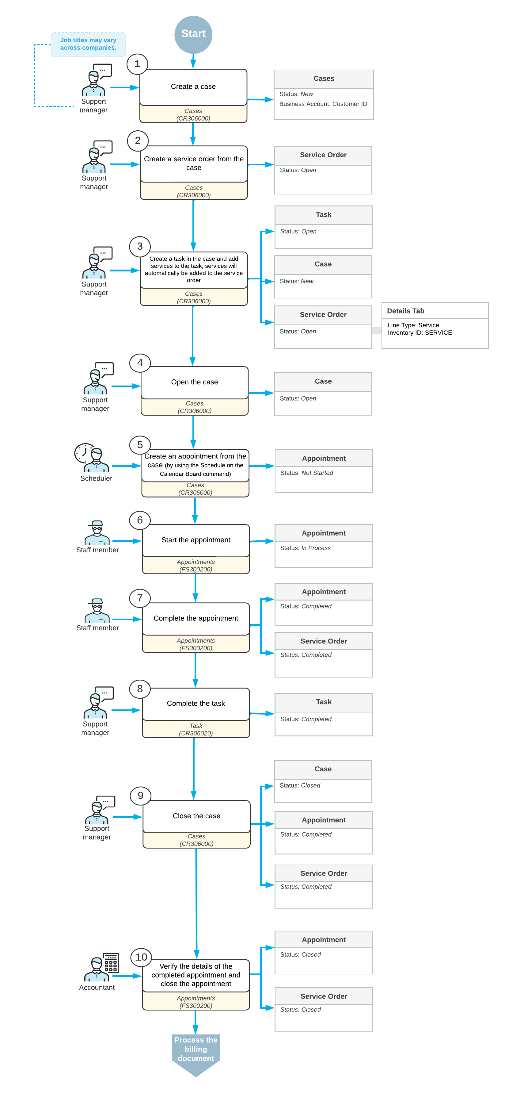 A customer case can be processed along with a service order while the services necessary to resolve the case are being performed. For example, suppose that the customer of your company has complained about some product that it purchased from your company. The case is received and entered into the system by a support manager of your company, who also creates a related service order for the repair of the product. Then the service manager and staff members further process the service order, and the support manager continues processing the case to its completion. The accountant then prepares invoices for the customer and processes them in the system.