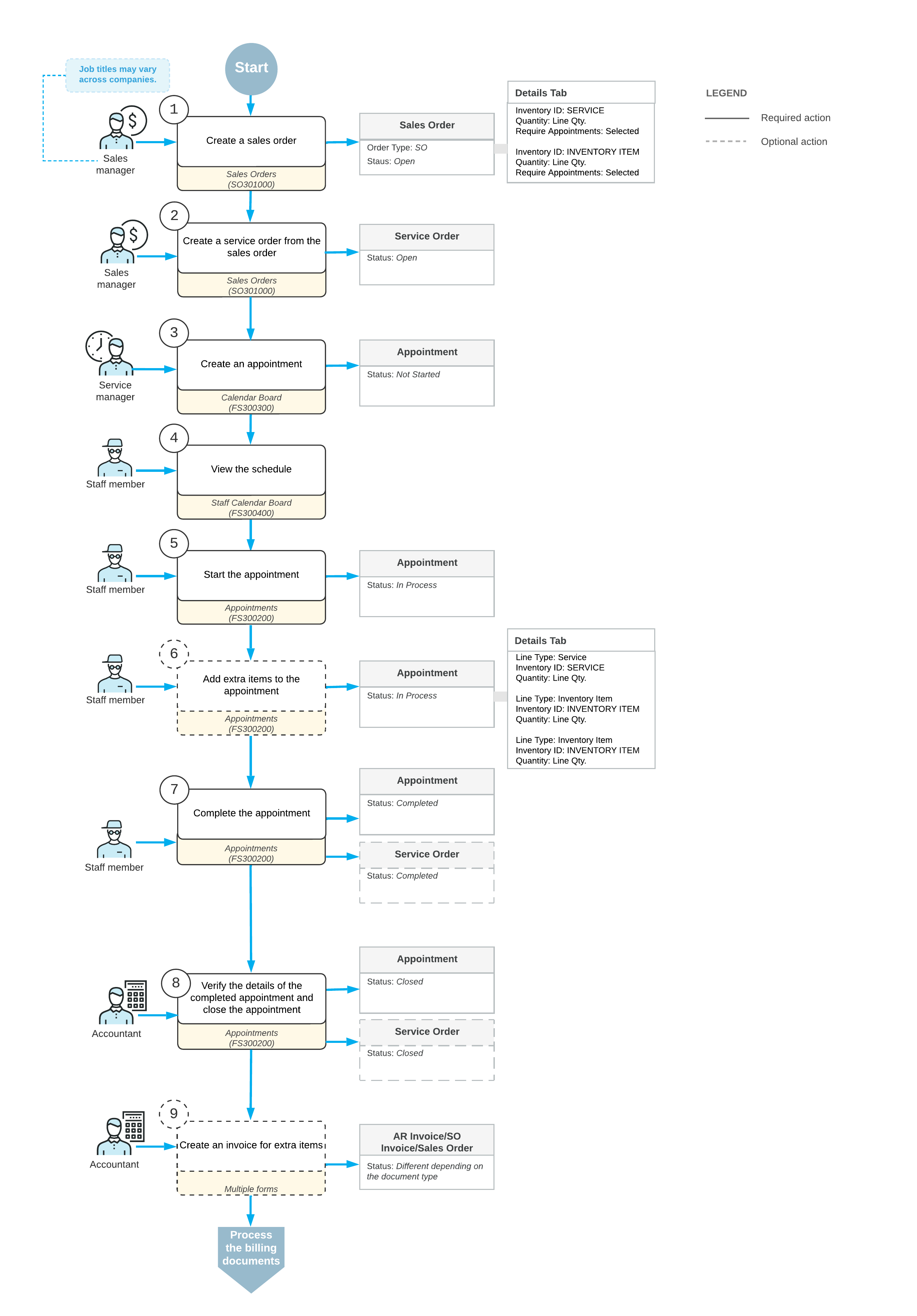 The staff member who is assigned to an appointment looks through the upcoming appointments on the Staff Calendar Board (FS300400) form and identifies which appointment need to be attended. The staff member then goes to the location where the service has to be performed and starts the appointment on the Appointments (FS300200) form. The appointment is assigned the In Process status.