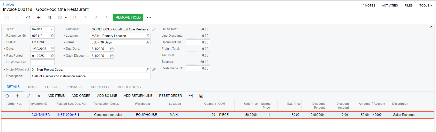 - Return to the Sales Orders (SO301000) form with the sales order you have created.