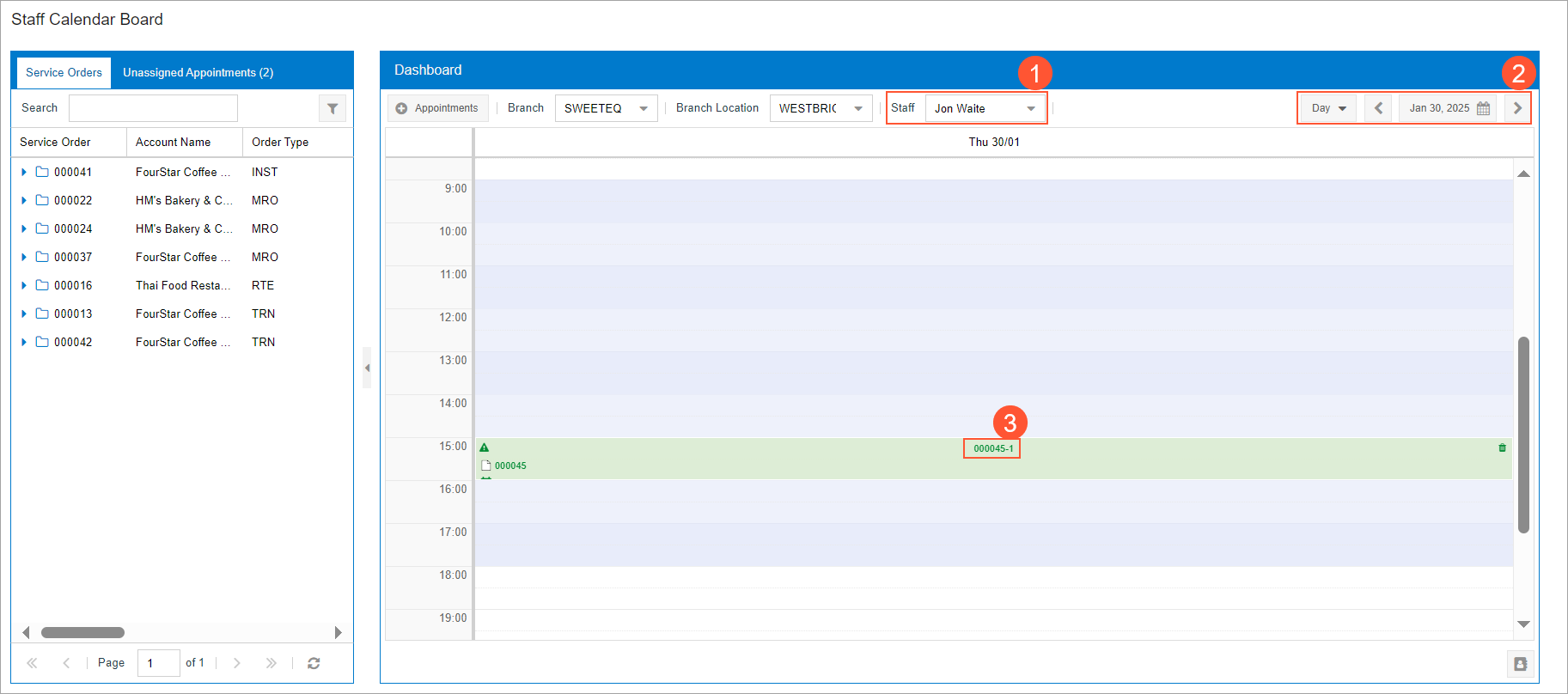 - Drag the service order from the Service Orders tab into the Jon Waite column of the dashboard area so that the start time of the appointment is set to 15:00.