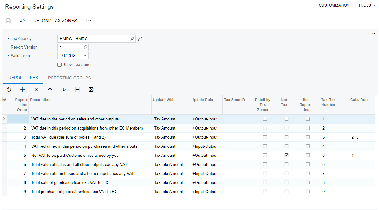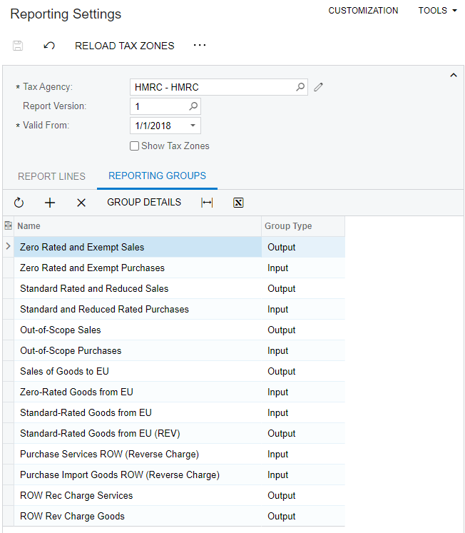 - The tax report has been created on the Reporting Settings (TX205100) form. For details, see Tax Report Configuration: General Information.